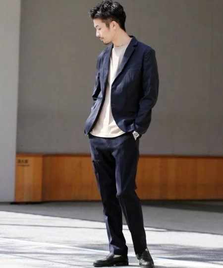 ネイビーのセットアップにベージュのTシャツを合わせた、春夏におすすめ爽やかな印象のコーディネートです。