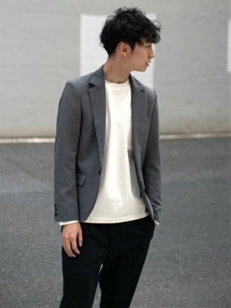 グレーのジャケットに白Tシャツのモノトーンコーデ。