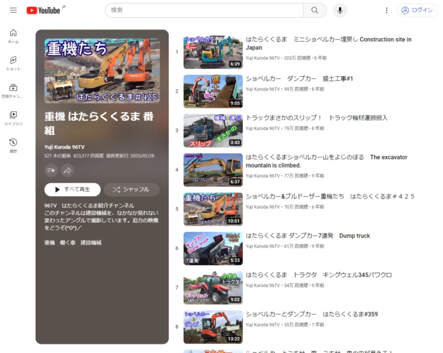 そんな人気の重機の魅力を余すことなく紹介している代表的なYoutubeチャンネルが「Yuji Kuroda 96TV」さんが運営する【重機 はたらくくるま 番組】。