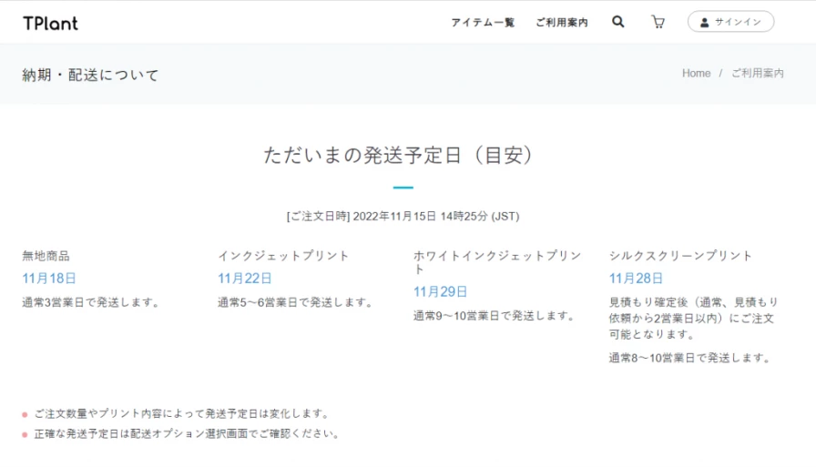 Tplantでは以下のページで現在のおよその納期を確認することができます。