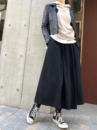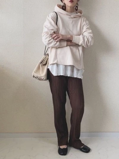 男性でも女性でも、パーカーを使ったレイヤードスタイルにするとナチュラルな“こなれ感”を演出できるので、細身のパンツやロングスカートなどでIラインを意識してコーデしてみてください。