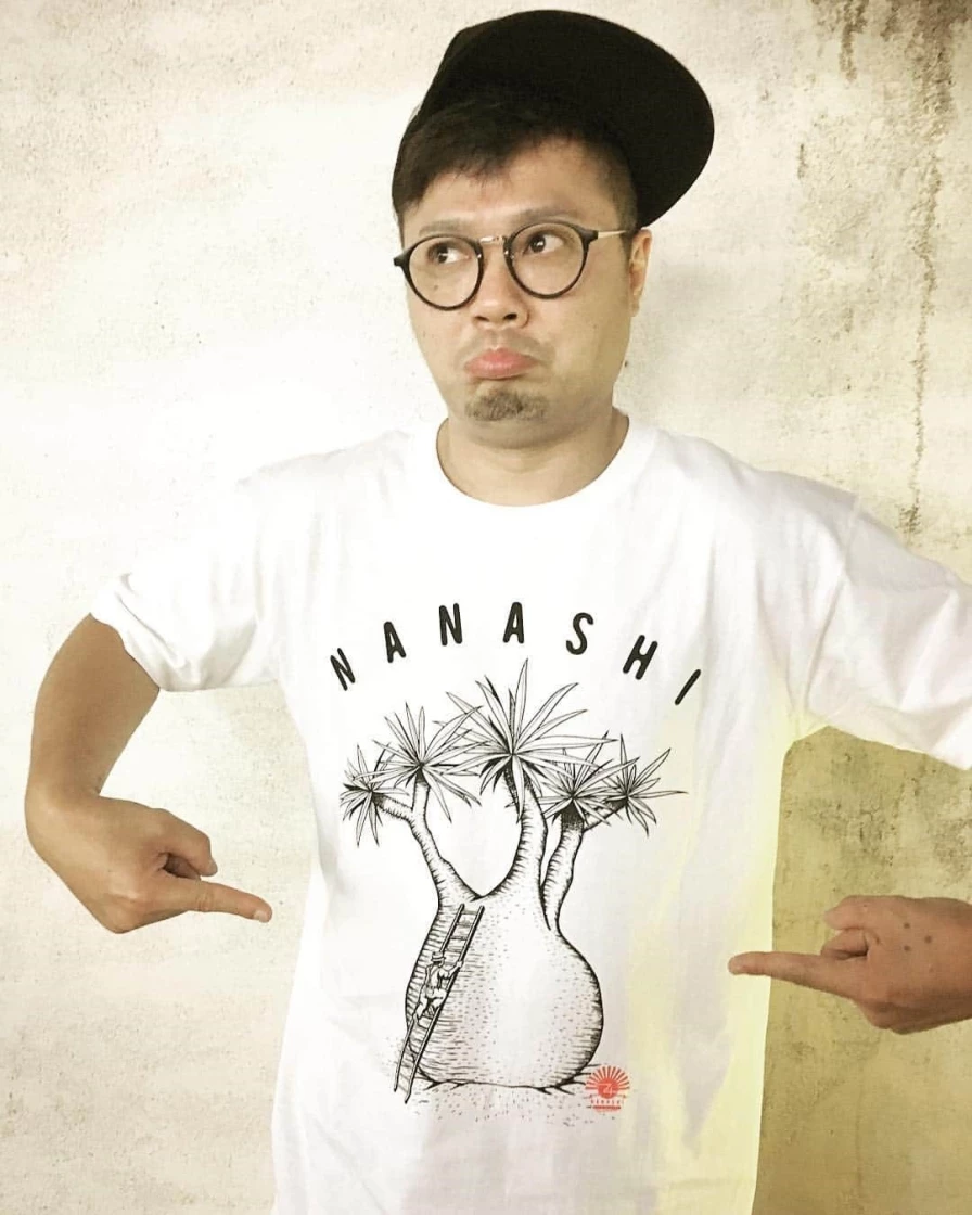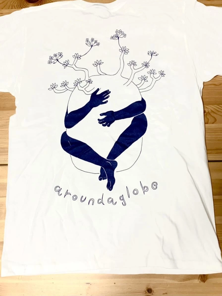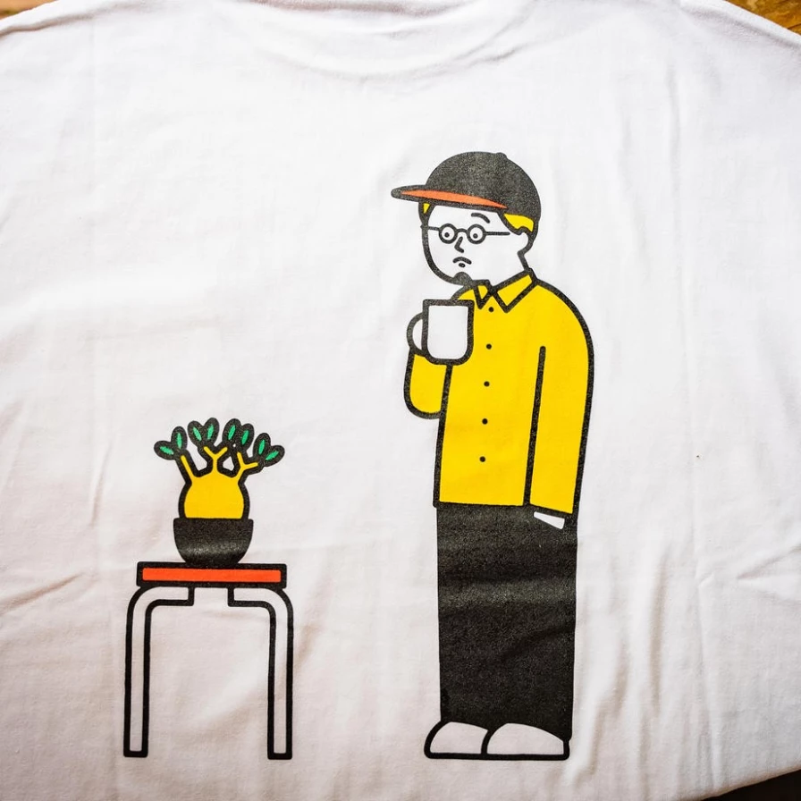 コーヒーショップ店主であり、塊根植物や陶器鉢などの情報を発信している青坊主さんをイメージしたデザインTシャツ。見ているだけで、ほっと一息しちゃいそうな、癒しを感じるイラストですね。