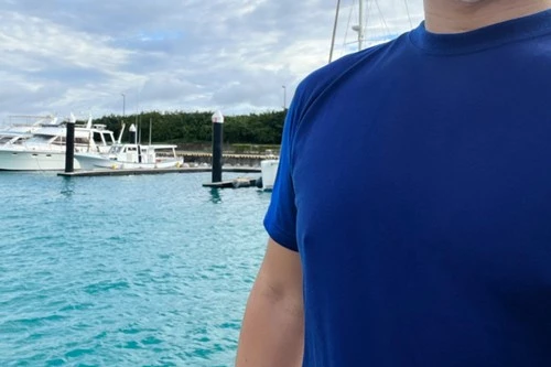 汗ジミが目立ちがちな青Tシャツですが、画像の通り全くと言ってもいいほど汗ジミが目立たない優れものとのことです。