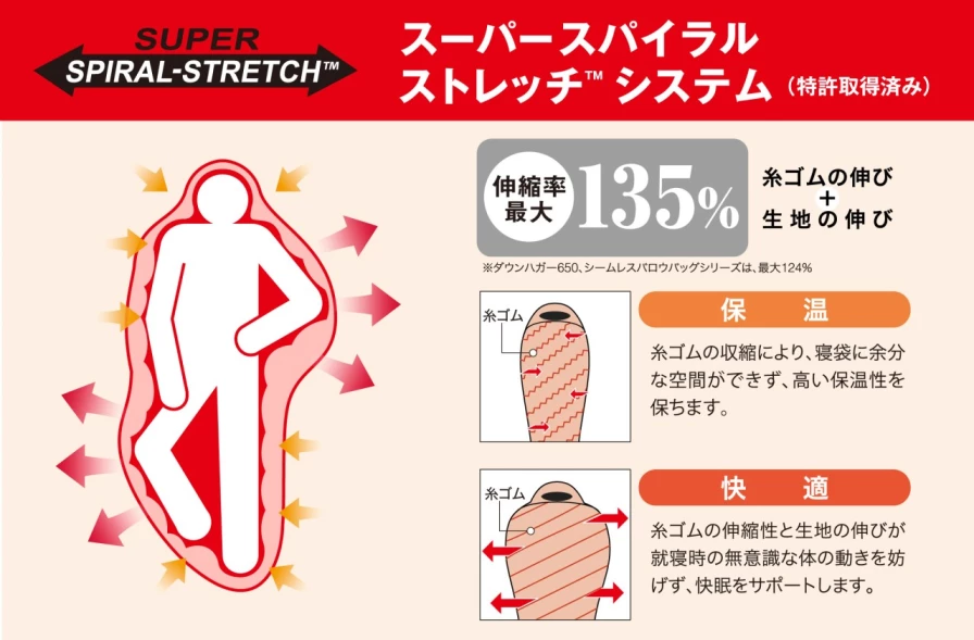 なかでも、ナンガやイスカとの大きな違いはその伸縮性。体に合わせて伸縮し、吸い付くようなフィット感はシュラフの中であぐらをかくことができ、寝返りは打ちやすく、窮屈さを感じることなく快適な寝心地を実感できるのです。