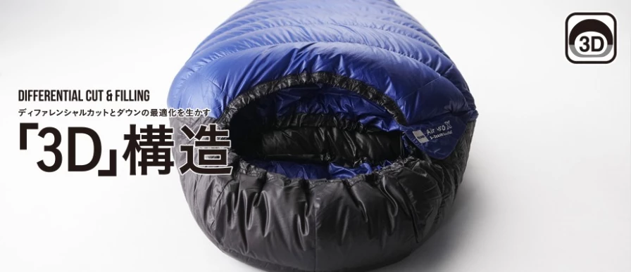 特筆すべく特徴は、エアモデルの3D構造。足元のシュラフの構造はかまぼこの断面のように上部が膨らんだ3D構造で、中に入れるダウン量は足元を多めにするなどエリアごとで工夫しています。また、内側と外側の生地を異なるサイズで裁断・製法するボックス工法では、圧迫感が少なく、身体のラインに沿った快適なフィット感を得られます。