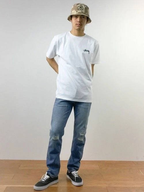 トレンドのデニムのダメージ具合も今年っぽさが前面に出ています。左胸のステューシーのロゴがさりげなくこなれ感をアピール。
